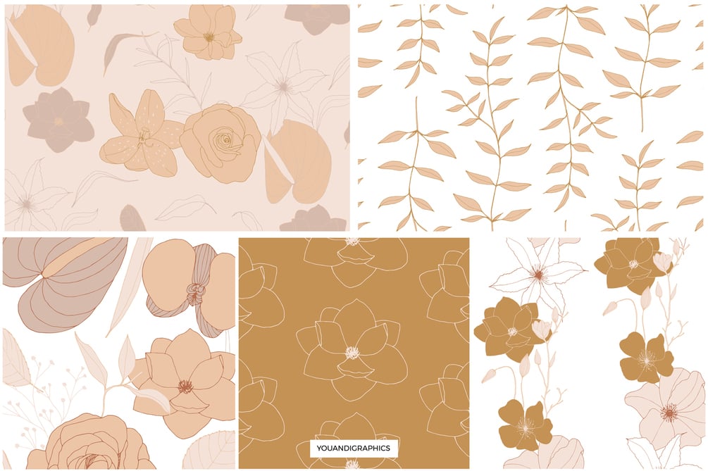 Blooming Garden Floral Patterns a set of Seamless Vector Patterns, Flower Illustrations and Vector Floral Compositions created by line art hand drawings. A selection of hand drawn flowers in elegant line work and a lovely blush/gold color palette that creates a unique selection of seamless floral patterns.