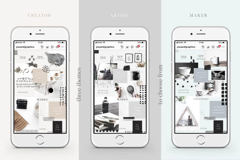 Are you a creator, a maker, an artist, do you love crafts and anything DIY? Τhis product is designed to save you lots of time from working on your Instagram profile. The Instagram Grid Posts - Creator's Edition are 3 Adobe Photoshop (.psd) pre-sliced files with 27 posts that form a cohesive, stylish look and feel this type of photo collage feed is called a puzzle. Choose the one that fits you best or how about you use them all consecutively?!